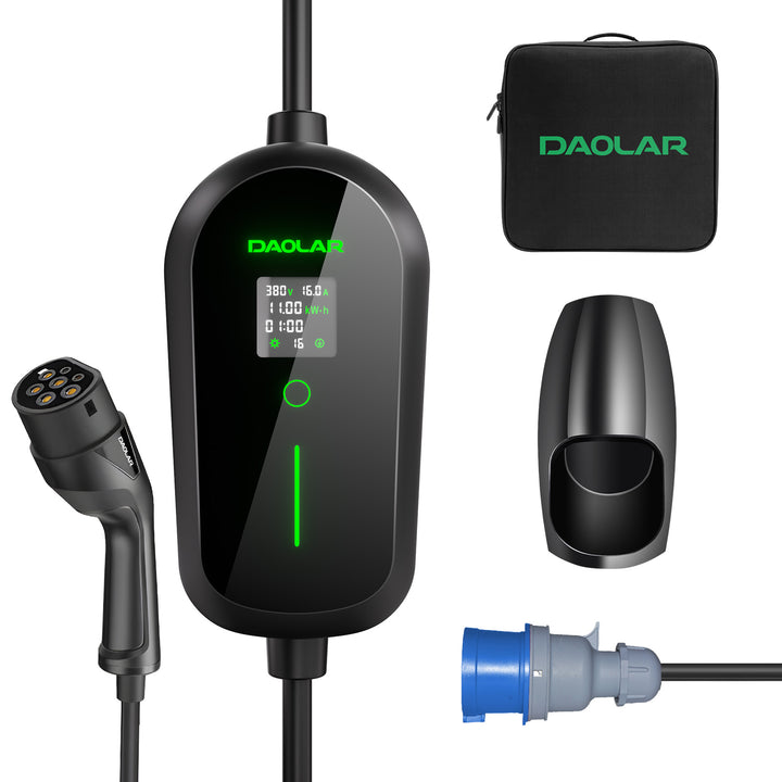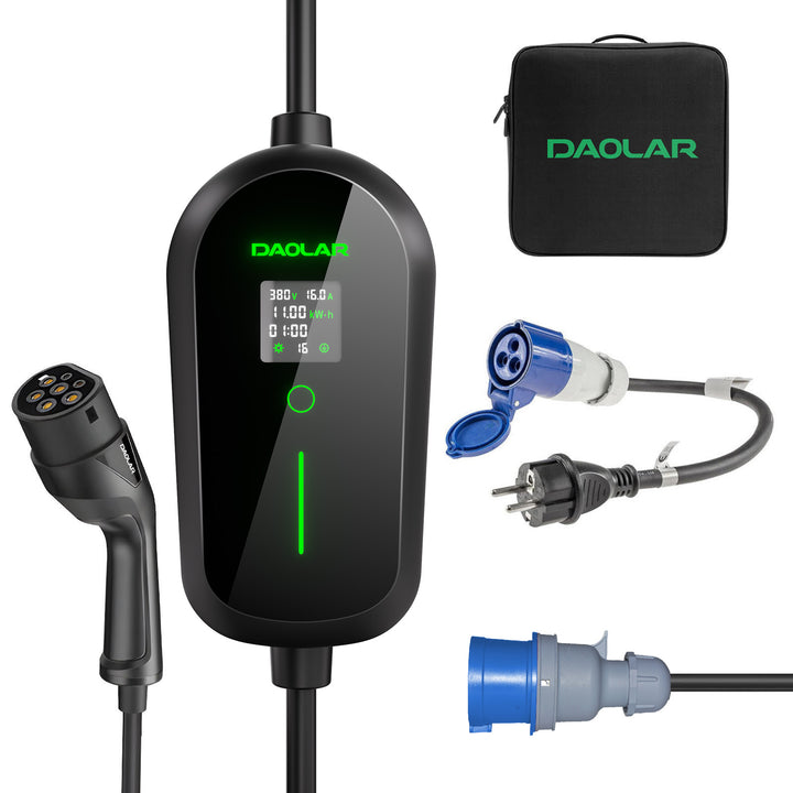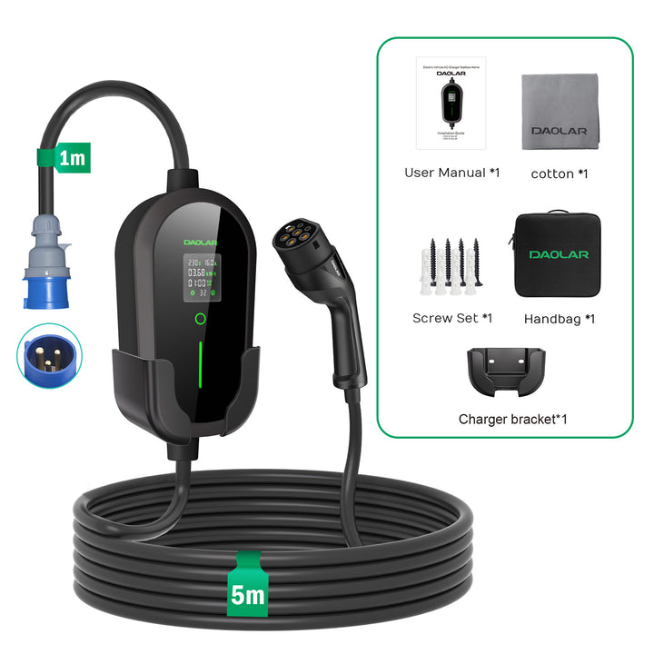 Kabel ładujący Daolar typu 2 z wtyczką CEE 7,4 kW [1-fazowy | 5 m | 6-32 A] z regulowaną mocą ładowania, ładowarka EV i mobilna stacja ładowania / skrzynka ścienna do ID.3, ID.4, ID.5, Model Y / 3, e-up, e-tron, Zoe