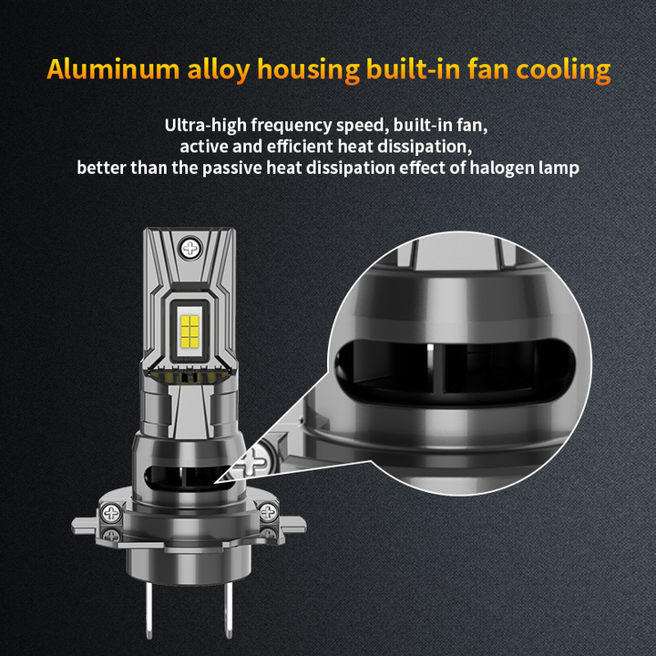 Aktywny system chłodzenia dla wydłużonej żywotności: Wyposażony w wbudowany, ultraszybki wentylator w obudowie ze stopu aluminium, system ten zapewnia aktywne i efektywne odprowadzanie ciepła. To zaawansowane chłodzenie działa lepiej niż pasywne zarządzanie ciepłem w lampach halogenowych, chroniąc diody LED i wydłużając całkowitą żywotność produktu.