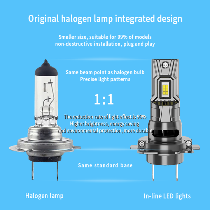 Projekt 1:1 zintegrowany z halogenem dla łatwej instalacji: Zaprojektowany tak, aby idealnie dopasować się do rozmiaru i standardowej podstawy oryginalnej żarówki halogenowej (w stosunku 1:1), zapewniając bezinwazyjną instalację typu plug-and-play, odpowiednią dla około 99% modeli pojazdów. Uzyskaj precyzyjne wzory światła i bezproblemową wymianę w kilka minut.