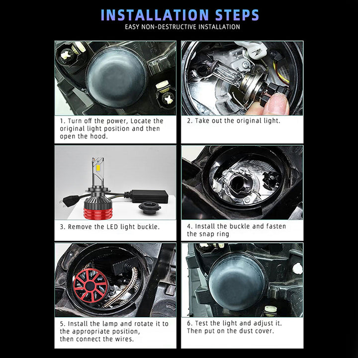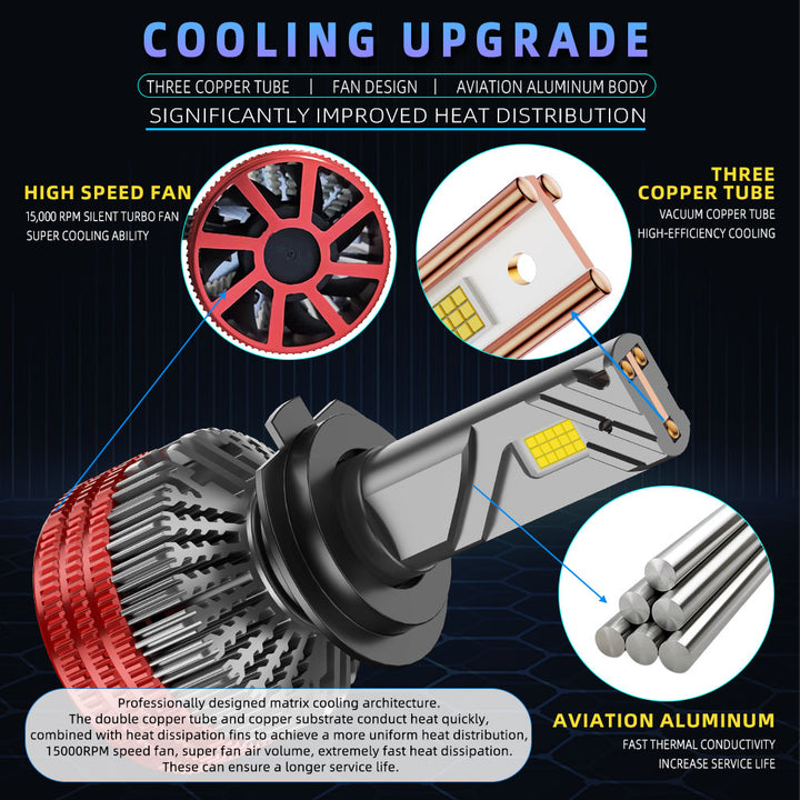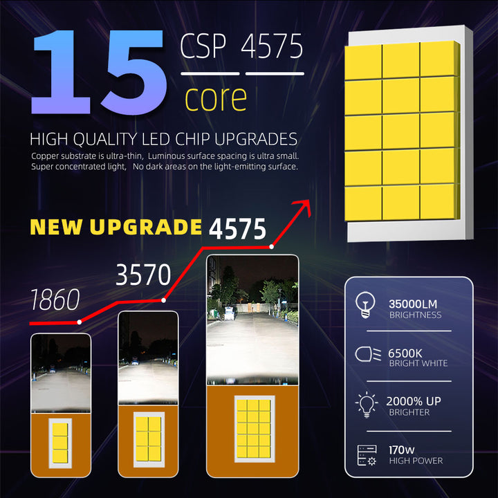 EKSTREMALNA JASNOŚĆ Z 15-RDZENIOWYMI CHIPAMI CSP 4575: Zaprojektowany z najnowszą technologią diod LED 15-rdzeniowych CSP 4575, ten zestaw reflektorów dostarcza aż 35 000 lumenów i 170W mocy na zestaw. Przy temperaturze barwowej 6500K chłodnej bieli, te żarówki są 2000% jaśniejsze niż standardowe halogeny, zapewniając szerszy i dalszy zasięg oświetlenia, eliminując ciemne obszary na drodze.